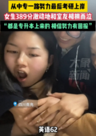 事情發(fā)生在四川南充,一位女生參加研究生考試,查到分數(shù)的那一刻,她和室友情緒激動,相擁而泣,為了考研她付出了很多,389分并不算太高,但這證明她努力了。