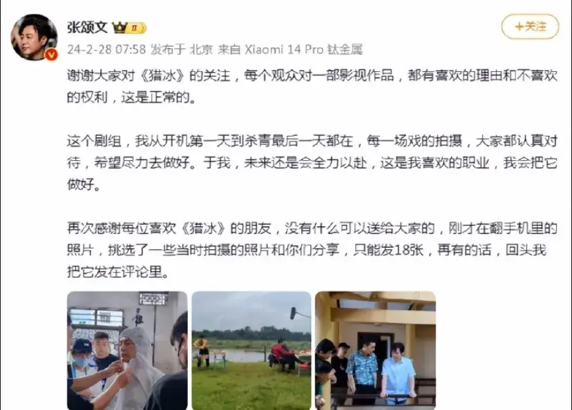 ?2 月 28 日,張頌文通過微博回應了《獵冰》的爭議。他的言辭謙遜溫和,充分流露出對觀眾不同觀點的尊重與理解。