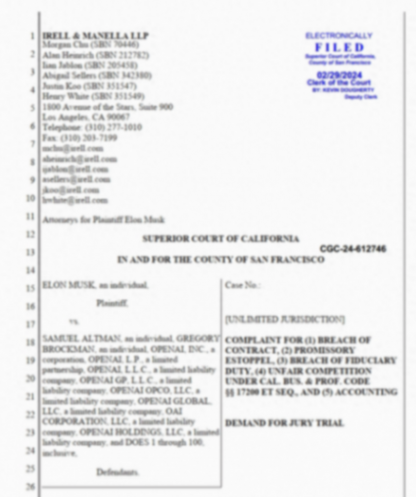 法院文件顯示,馬斯克對OpenAI提出了包括違約、違反信托義務和不公平商業行為在內的指控,并要求該公司恢復開源。馬斯克還要求法院下達禁令,禁止OpenAI、其總裁格雷戈里·布羅克曼和奧爾特曼(此案的共同被告)以及微軟從該公司的人工通用智能技術中獲利。