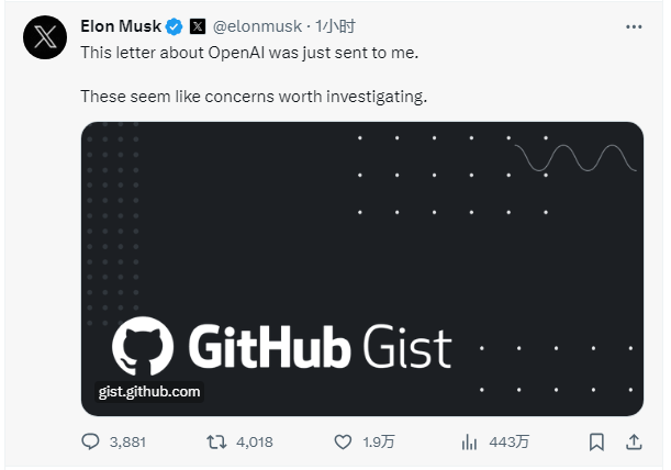 2023年11月22日,馬斯克在X(原推特)上轉發了一個GitHub鏈接,稱“這封關于OpenAI的信是剛剛發送給我的,(信中的)這些問題似乎值得調查”。