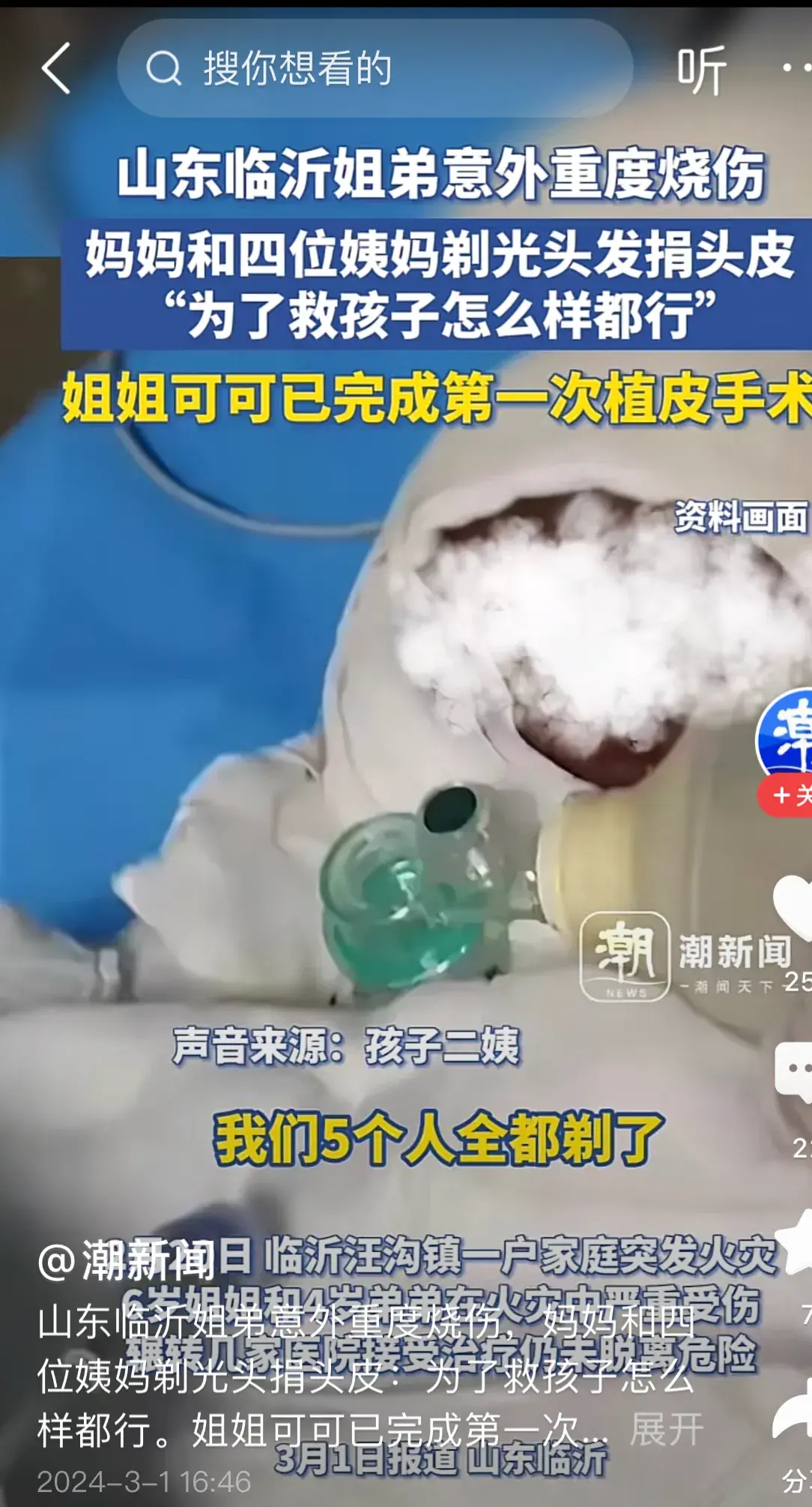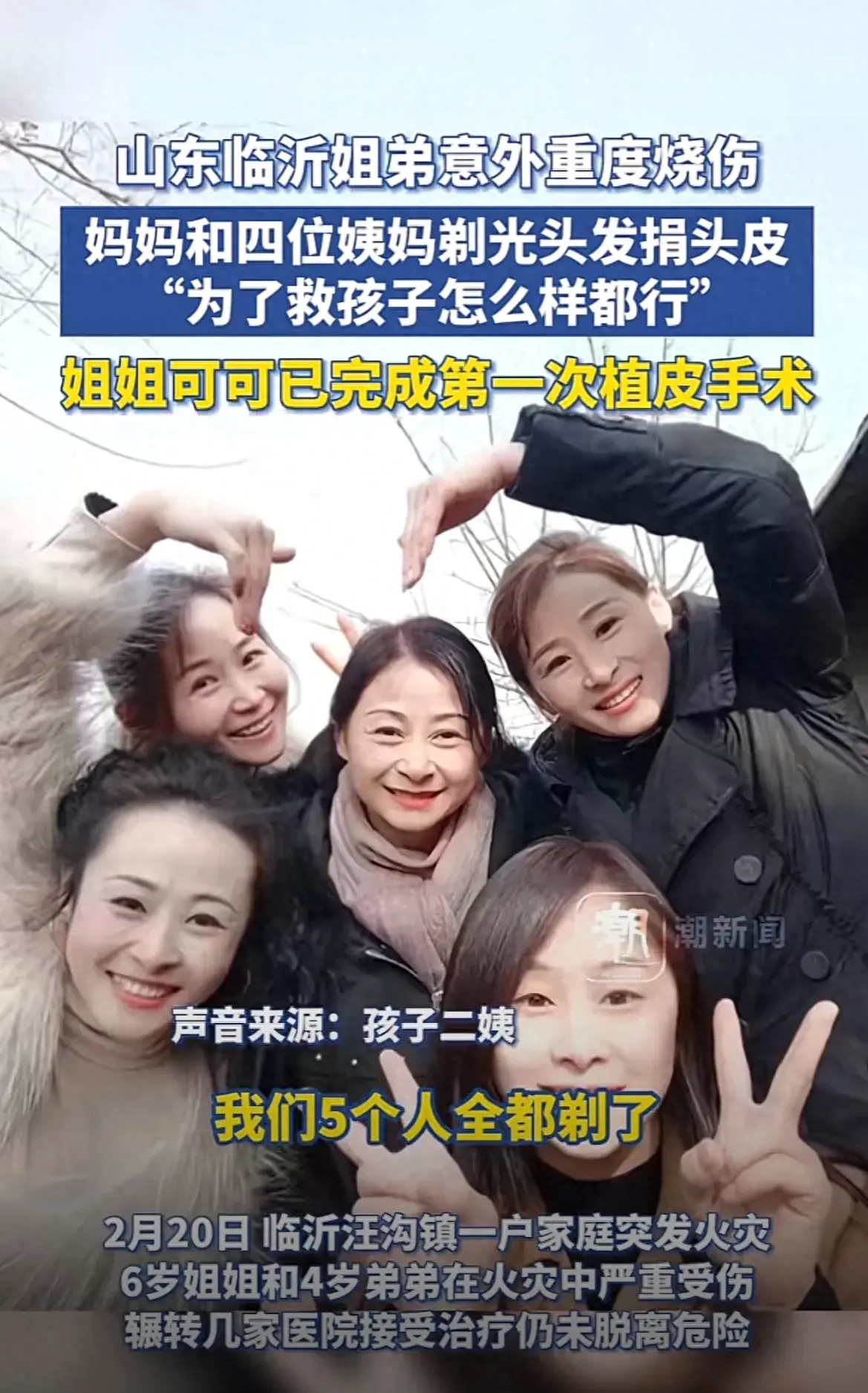 日前,山東臨沂震驚一座城的悲劇突然發生。姐弟在一次電力事故中遭受嚴重燒傷,母親也不幸被大火包圍,重度燒傷傷及全身。面對困境,四位勇敢的姨媽站了出來,毅然剃光頭發,將自己的頭皮無償捐給了媽媽和姐弟,為他們帶去希望和治療的機會。