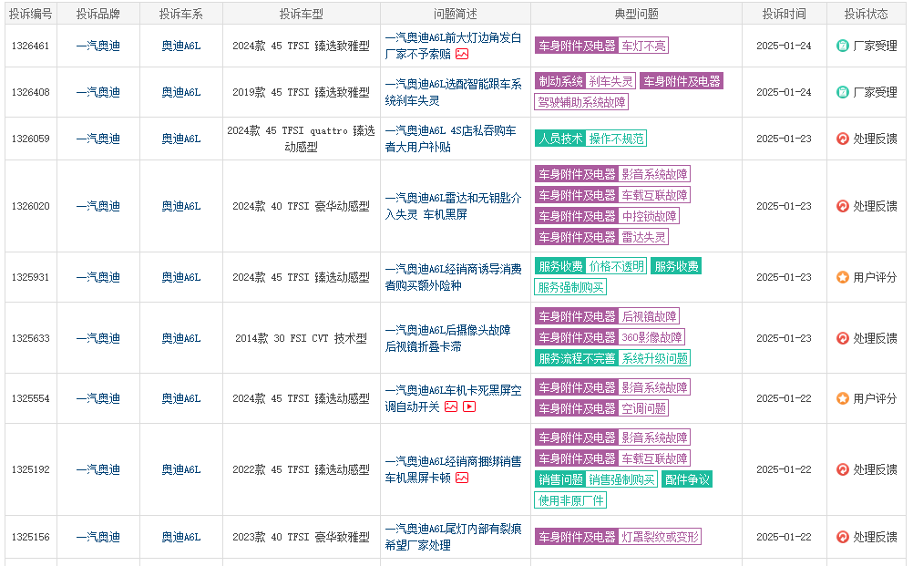 此外,在產品品質方面一汽奧迪同樣有較大的提升空間。從相關汽車投訴平臺查詢,一汽奧迪A4L、A6L存在比較嚴重的變速器異響及發動機故障問題,還有車身附件及電器也存在一些諸如影音系統故障、座椅故障、燈罩裂紋或變形等問題。而奧迪Q5L因發動機故障、影音系統故障、車身共振等問題而遭到不少車主的投訴。