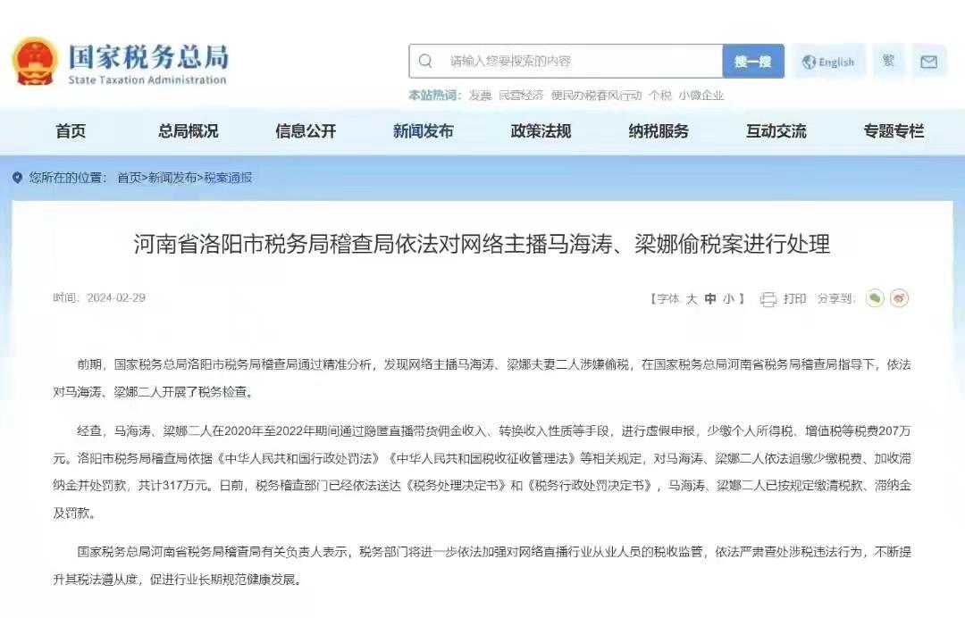"小馬哥"夫婦顯然就是這一類(lèi)人的,2月29日,一則關(guān)于對(duì)網(wǎng)絡(luò)主播馬海濤、梁娜偷稅案進(jìn)行處理公告。原來(lái)二人在兩年間,通過(guò)隱匿、轉(zhuǎn)換收入等形式,少繳稅207萬(wàn)元。最終加上滯納金、罰款等,兩人總共補(bǔ)繳317萬(wàn)。