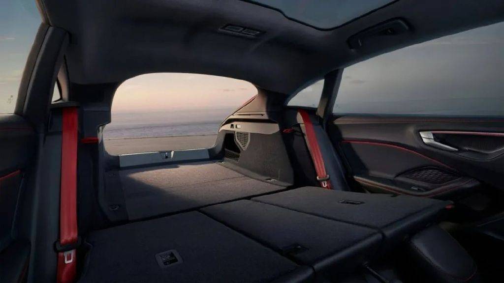 別看它是轎跑,實用性出乎意料。掀背尾門設計讓開口很大,放行李箱、搬大件物品都很輕松。平時不放倒后排座椅的時候,容積就有410L,日常購物或者周末短途旅行都夠用了。后排座椅放倒后,空間直接能擴展到1361L,而且地板幾乎是純平的,放大件物品特別方便。