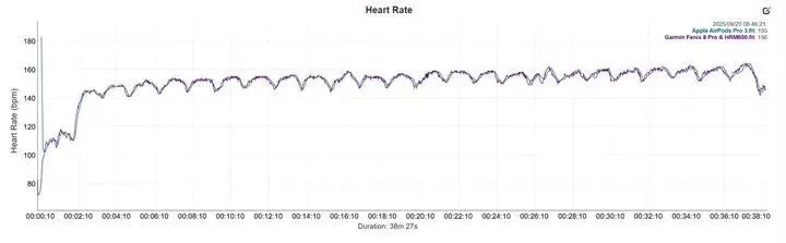 Nick Harris-Fry 以 Garmin HRM600 胸帶(電信號級精度)作為對照,結果發現 AirPods Pro 3 的心率曲線幾乎與胸帶重合,尤其在穩態跑與間歇跑這種對精度要求極高的場景下,兩條曲線如同鏡像般貼合。