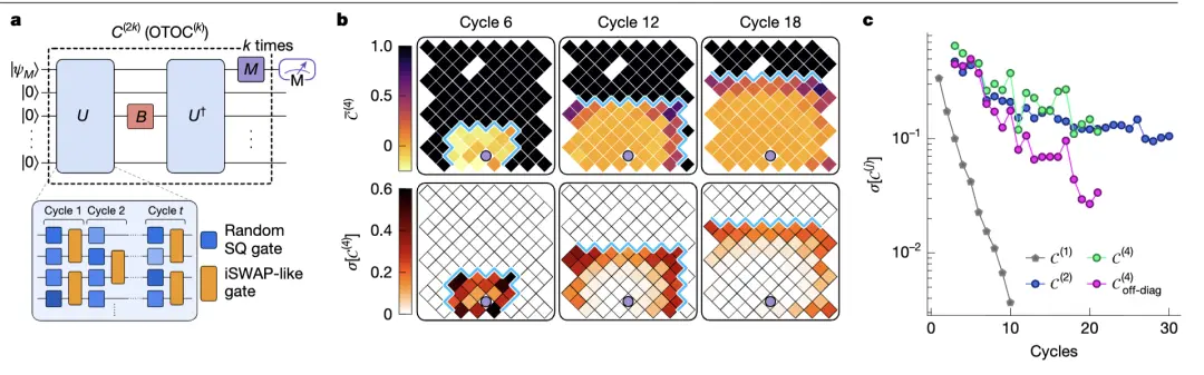 傳統(tǒng)的TOC信號(hào),演化9個(gè)周期后就弱到幾乎測不到(標(biāo)準(zhǔn)差<0.01);但測的OTOC(尤其是二階 OTOC,記為 OTOC?²?),就算演化20個(gè)周期,信號(hào)依然清晰(標(biāo)準(zhǔn)差>0.01)。