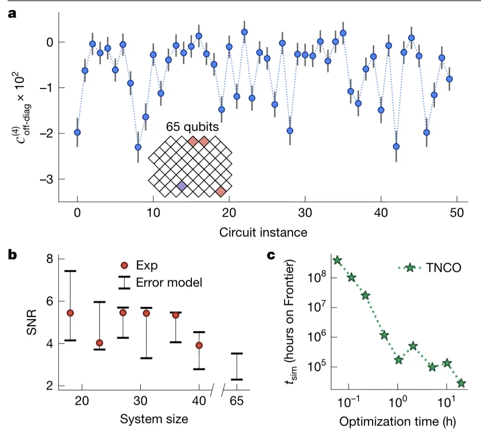 這種“大循環(huán)干涉”讓經(jīng)典計(jì)算機(jī)很難模擬。他們用最強(qiáng)超級(jí)計(jì)算機(jī)Frontier嘗試模擬 65 個(gè)量子比特的 OTOC?²?信號(hào),需要約 3.2 年;而量子處理器測一次只需要 2.1 小時(shí),速度差了1.3萬倍。