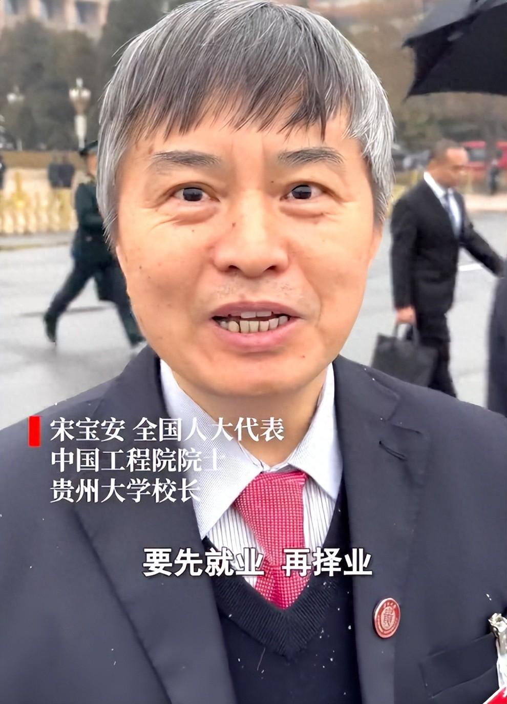 據(jù)中國(guó)新聞周刊報(bào)道,3月5日,全國(guó)人大代表、中國(guó)工程院院士、貴州大學(xué)校長(zhǎng)宋寶安接受記者采訪時(shí)表示,大學(xué)生就業(yè)要樹(shù)立正確的就業(yè)觀,“先就業(yè)再擇業(yè),無(wú)論在大城市或者基層,都能發(fā)揮自己的作用。”