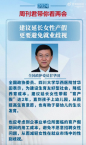全國政協委員、四川大學華西醫院甘華田接受采訪時表示,為建設生育友好型社會,降低養育成本,建議延長女性帶薪“育產假”達2年,直到孩子上幼兒園,從而提高生育意愿,也有助于嬰幼兒的生長發育。