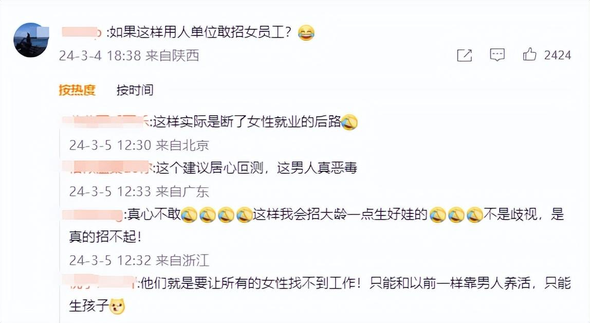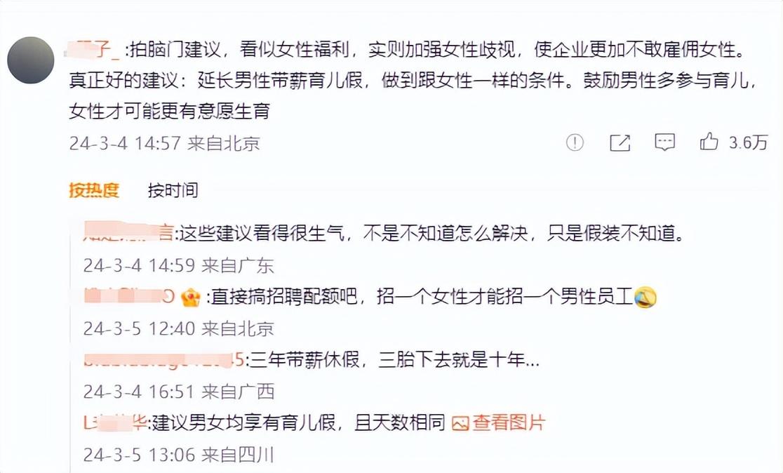 網友:拍腦門建議,看似女性福利,實則加強女性歧視,使企業更加不敢雇傭女性。真正好的建議:延長男性帶薪育兒假,做到跟女性一樣的條件。鼓勵男性多參與育兒,女性才可能更有意愿生育