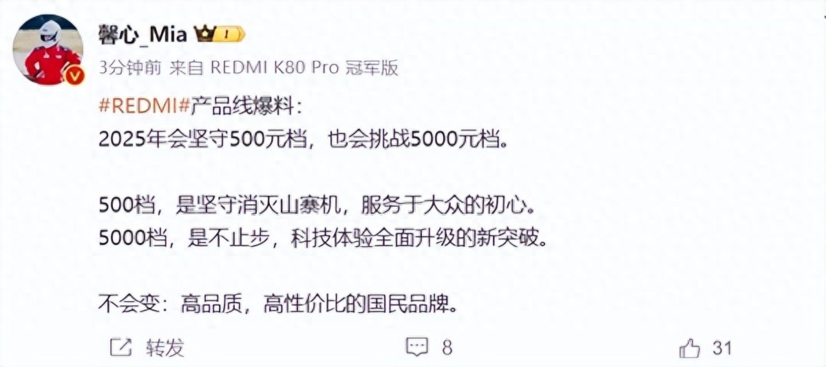 產(chǎn)品經(jīng)理@馨心_Mia 今日也透露了2025年REDMI的產(chǎn)品線規(guī)劃,她表示紅米今年會(huì)堅(jiān)守500元檔,也會(huì)挑戰(zhàn)5000元檔!其中500元檔堅(jiān)守是為了消滅山寨機(jī),服務(wù)于大眾的初心。而5000元檔是為了全面升級突破