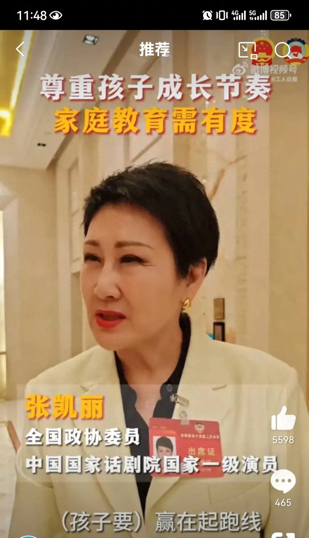 近日,全國(guó)政協(xié)委員,中國(guó)國(guó)家話劇院國(guó)家一級(jí)演員張凱麗 接受采訪時(shí)表示。“我們鼓勵(lì)孩子們?nèi)ヅι?、學(xué)習(xí),成為國(guó)家棟梁,但是一定要根據(jù)孩子們的心智和需要,他們?cè)谛r(shí)候可能就是需要去玩耍,到了一定年齡以后再接受教育。