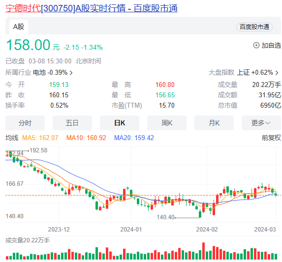 周日,寧德時代突然傳來重磅利好。摩根士丹利發布報告,將中國電池巨頭寧德時代(CATL)的評級上調至“超配”,并設定目標價為210元人民幣。而截至3月8日收盤,寧德時代僅報158元/股,也就是說這只股票離目標價還有30%以上的空間。