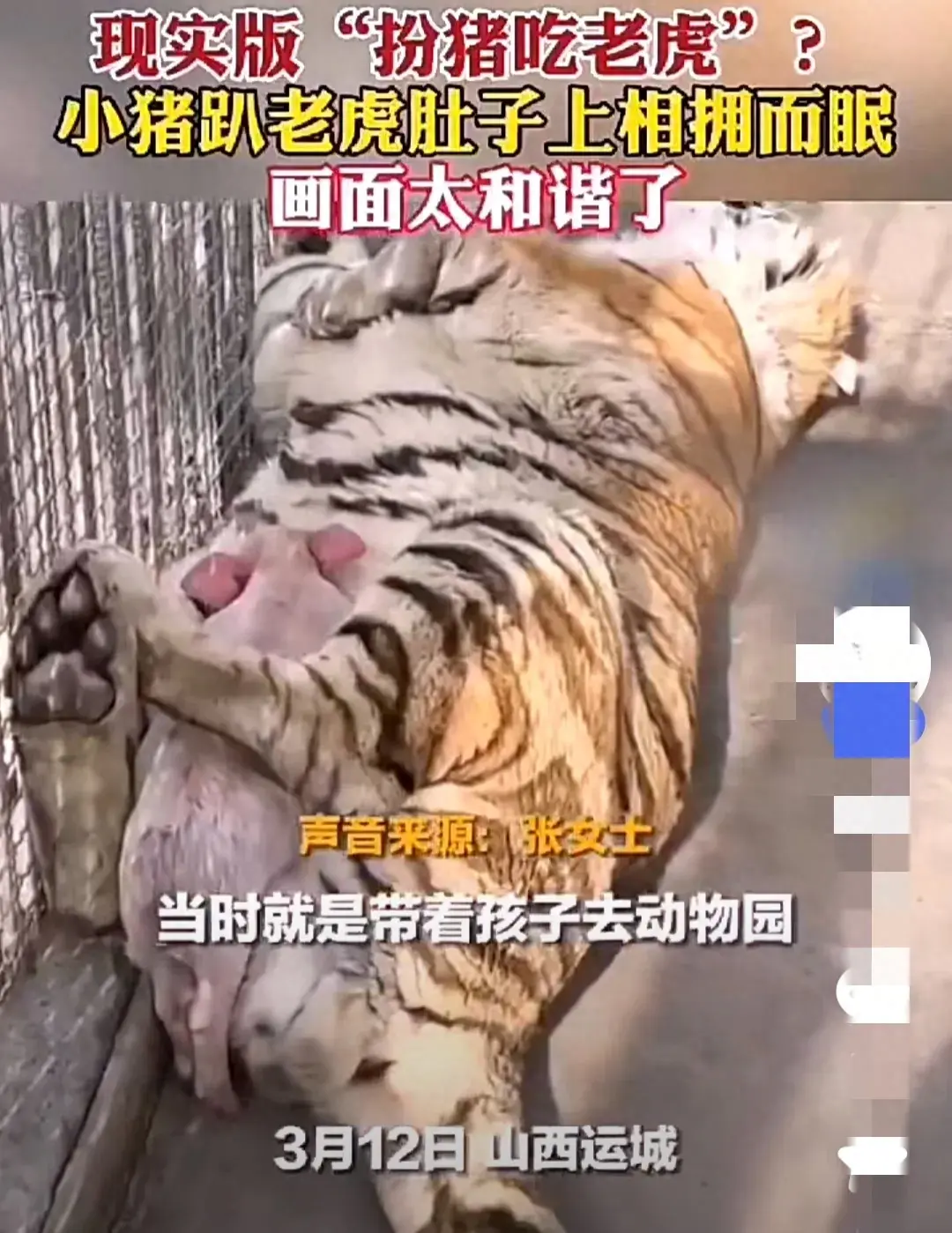 張女士趕緊用手機拍下了這一幕,并分享到了社交平臺上。很快,這段視頻就在網上引起了熱議。網友們紛紛表示,這樣的場景實在太少見了,小豬和老虎的和諧共處讓人感動,也讓人對大自然的神奇產生了更多的敬畏。