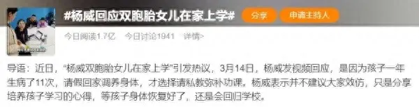 近日,“楊威雙胞胎女兒在家上學”的話題在社交媒體上引發熱議。體操奧運冠軍楊威在一條視頻中表示,孩子去年在家生病11次,大病三場,“三個娃的家庭,每次(孩子)生病就亂成了一鍋粥”,出于孩子和大人都需要休息的考慮,他才決定用私教補上孩子的功課。視頻中,楊威也表示,不建議大家效仿,一方面費用高昂,另一方面孩子在身體恢復后,還會回歸學校。