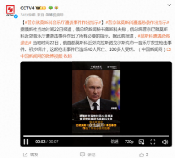 俄羅斯外交部22日說,當天在莫斯科近郊“克羅庫斯城”音樂廳發生的槍擊事件為恐怖襲擊。俄羅斯聯邦偵查委員會根據《俄羅斯聯邦刑法典》第205條(恐怖行為)條款進行刑事立案調查。