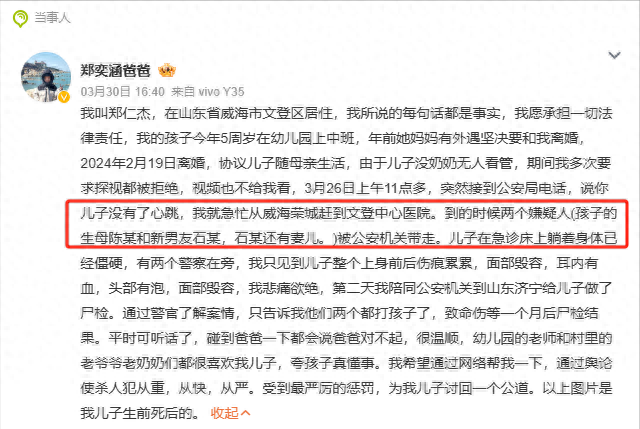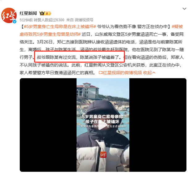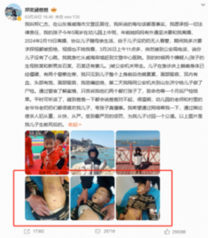 3月30日,山東威海一男子在網(wǎng)上實(shí)名發(fā)文:說(shuō)自己5歲的兒子疑似被虐待致死,嫌疑人正是自己的前妻,也就是孩子的生母,以及前妻的新男友。