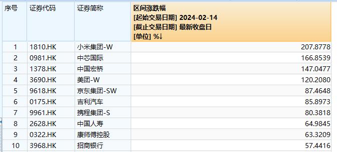 恒生指數成分股前十大漲幅榜中,小米集團-W以龍年漲207.88%排名第一,其次是中芯國際、中國宏橋、美團-W、京東集團-SW,龍年分別漲166.85%、147.05%、120.21%、87.46%。吉利汽車、攜程集團-S漲幅也超過了80%。