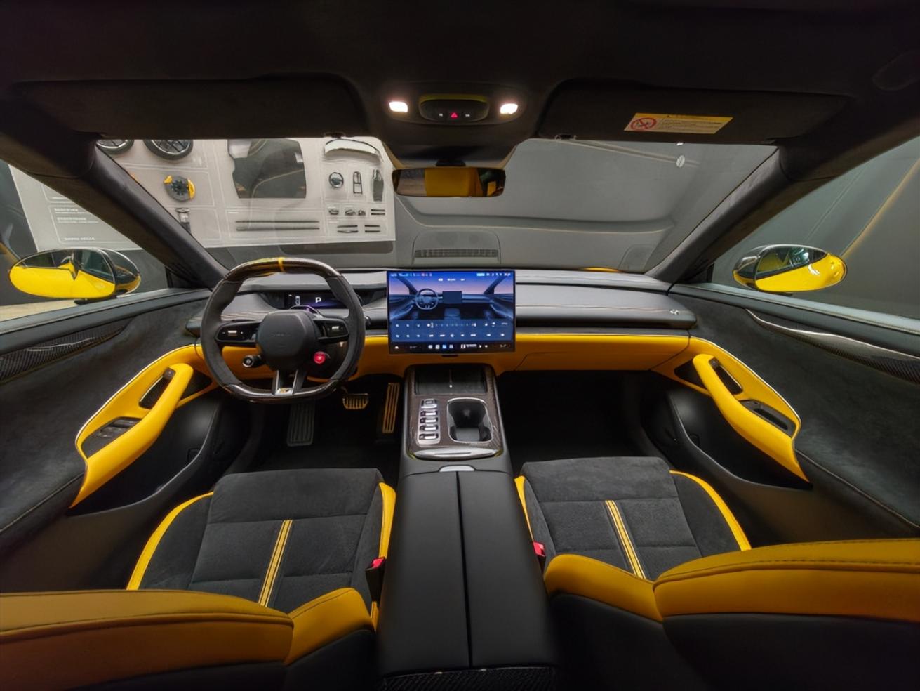 內部設計,同樣與普通版車型有著明顯的差異性,新款的碳纖維上車了,翻毛皮的車頂,運動化的座椅全部都上車,并且連方向盤都是專門打造的賽車樣式的翻毛皮設計。從配置層面來看,16.1英寸的3k高清大屏,高通驍龍8295的芯片,7.1英寸的全液晶行車電腦,LED數字抬頭顯示,帶激光雷達的高階智駕系統全部上車。