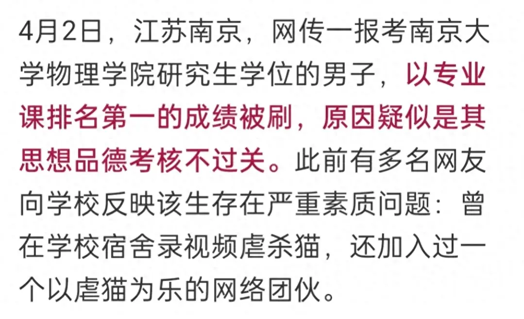 南京大學招生辦相關負責人表示:徐徐某某理論考試第一名卻被復試淘汰的,也因公開信息上已經講的很清楚,因為思想品德不過關,其中因素不排除“虐貓事件”,學校曾經收到過多次舉報,關于徐某某虐待動物的報告。