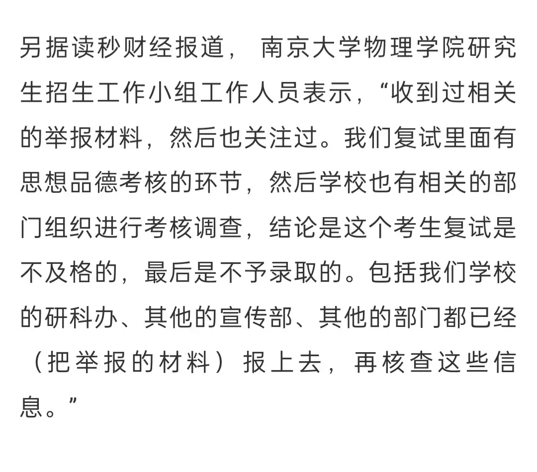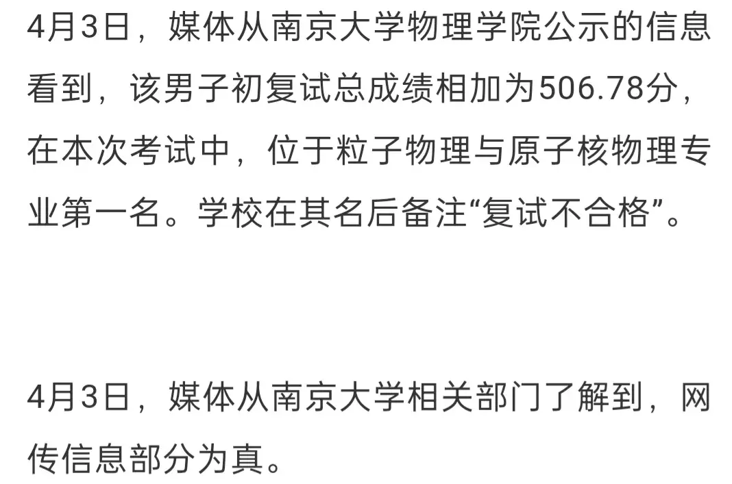 根據南京大學物理學院的公開信息顯示,徐某某以理論成績506.78的高分,獲得粒子物理和原子核物理的第一名,但在復試過程中卻被無情的淘汰。