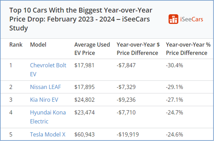 這份報(bào)告的數(shù)據(jù)顯示,過去一年時(shí)間里,特斯拉美國(guó)市場(chǎng)上的平均二手車價(jià)格從51232美元跌至36515美元,降幅高達(dá)28.9%,是美國(guó)市場(chǎng)上貶值幅度最大的品牌。