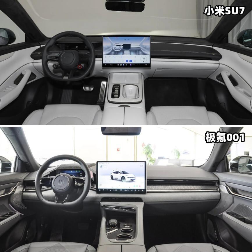 內飾上,小米SU7有一塊可翻轉的7.1英寸全液晶儀表和16.1英寸的中控屏,車輛在啟動時可以實現翻轉,儀式感滿滿。車機內置了高通8295芯片,另外小米SU7的內飾有很多非常人性化的設計,這點我們放到后面再聊。然后咱們再來看看極氪001,該車采用了與001 FR相同的設計,全液晶儀表為13.02英寸,中控屏則采用了15.05英寸的屏幕,而且還支持向駕駛員或者副駕傾斜的功能。車機同樣內置了高通8295芯片,而且極氪001上還有一個“極氪影院”的功能,就是通過全車28個揚聲器、座椅震動、升降和香氛等設備,打造出類似5D的電影效果,而且還支持外插Switch和游戲手柄等,娛樂性還不錯。