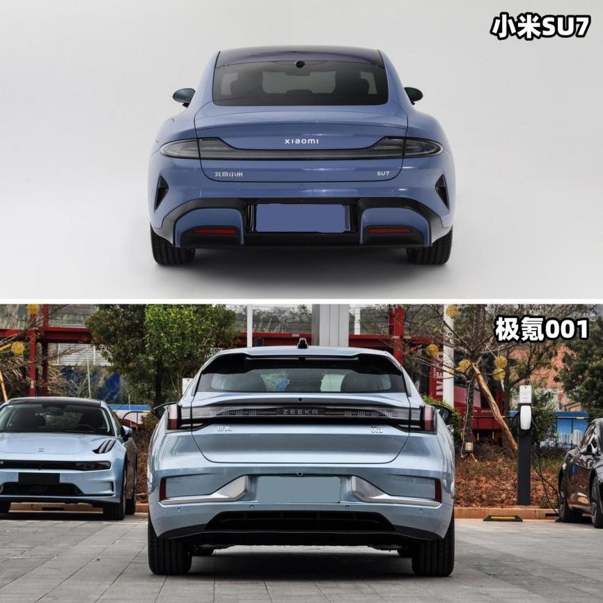 最后再來看看車尾,小米SU7的尾燈采用星環設計,下方是大面積的黑色后包圍,在內部還有與車身同色的裝飾,另外兩側同樣也有進氣口。而極氪001,其后風擋上配備了001 FR同款的擾流板,中央是貫穿式尾燈,同樣很有設計感,下方的后包圍也采用了001 FR的造型。