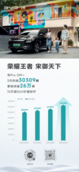 截至目前,宋Pro DM-i榮耀版經歷了上市以來首個完整銷售月,并交出了一份優異的成績單——3月熱銷30309輛,環比增長256.6%,累銷超過26萬輛,以絕對優勢領跑A級SUV市場!如果說,此前宋Pro DM-i與燃油車進行拉鋸戰,那么隨著宋Pro DM-i榮耀版的推出,其將向對手發起全面總攻,從燃油SUV顛覆者轉變為燃油SUV的替代者!