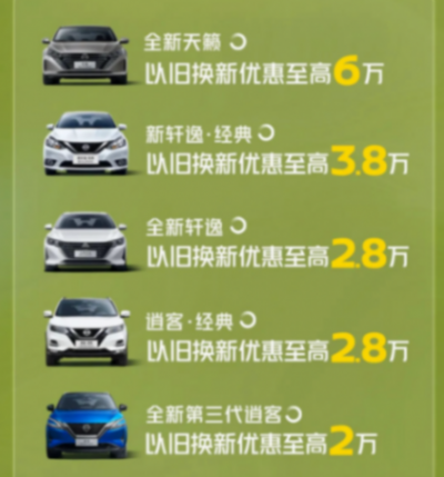 首先率先響應(yīng)“降價(jià)”號(hào)召的就是東風(fēng)日產(chǎn),4月2日,東風(fēng)日產(chǎn)推出“超級(jí)置換季”活動(dòng),官方表示,全車系以舊換新優(yōu)惠至高6萬。具體來看,天籟以舊換新優(yōu)惠至高6萬,軒逸·經(jīng)典以舊換新優(yōu)惠至高3.8萬,軒逸以舊換新優(yōu)惠至高2.8萬,逍客·經(jīng)典以舊換新優(yōu)惠至高2.8萬,逍客以舊換新優(yōu)惠至高2萬。