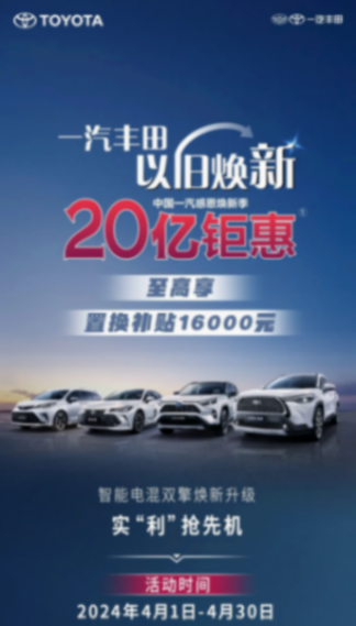 接著就是一汽豐田,4月3日,一汽豐田推出以舊煥新活動(dòng),針對(duì)4月1日至4月30日購(gòu)車的用戶,全車系可享至高8年0首付、36期0利率、至高16000元置換補(bǔ)貼,以及價(jià)值498元的回廠禮等多重權(quán)益。