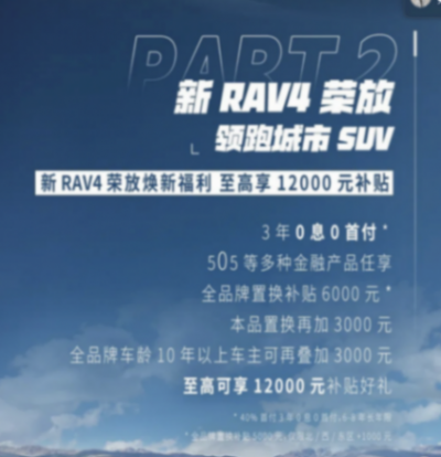 針對(duì)具體車型,比如亞洲龍可以享受3年0息0首付、全品牌置換補(bǔ)貼6000元、本品置換再加3000元、10年以上老車主置換至高享12000元煥新基金。至于RAV4榮放,更是把車齡10年以上車主擴(kuò)大到全品牌。優(yōu)惠明細(xì)一一列舉出來,至少消費(fèi)者看到后不會(huì)有受騙的感覺。