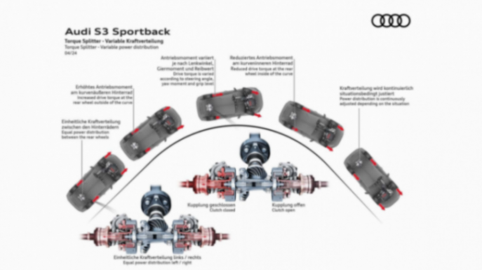 這個能獨(dú)立分配扭矩的后差速器,對于S3的意義還是很大的,這套復(fù)雜的差速器原理卻很好理解,就是在后差速器上,在左右兩邊獨(dú)立設(shè)置兩組多片離合器,實(shí)現(xiàn)為不同車輪的動力分配。在車輛轉(zhuǎn)彎時,為外側(cè)車輪提供更多的動力,減少內(nèi)側(cè)車輪的動力輸出,更好地利用有附著力的車輪。整體的效果類似限滑差速器,但由于能更靈活地分配動力,有更好的動態(tài)效果。奧迪S3雖然直線很強(qiáng),但因為偏前的四驅(qū),依舊很容易有轉(zhuǎn)向不足的情況,有了這套系統(tǒng),相信能擁有更靈活的尾部姿態(tài),不再只是蹦直線的04車。
