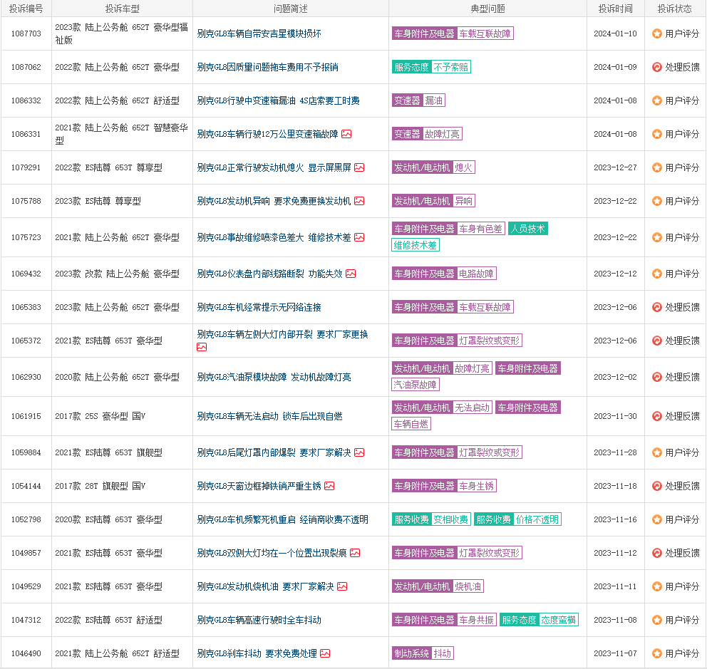 翻看車質網投訴平臺,我們還會發現,別克GL8各種小毛病也是層出不窮。小到故障燈亮、燒機油、異響,大到無法啟動、車身生銹、發動機熄火等,這些故障宛如田間枯草,野火燒不盡,春風吹又生。