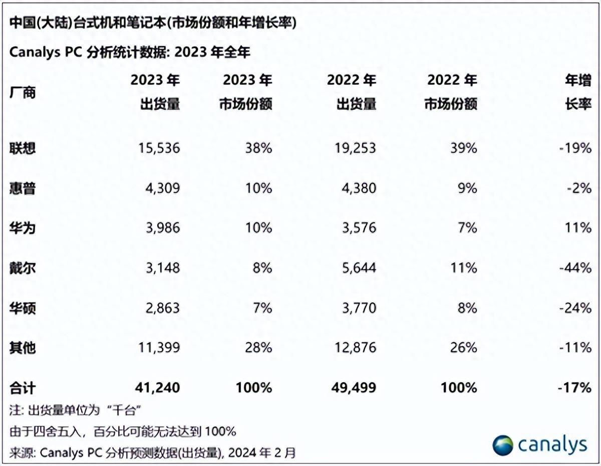 前幾天,知名機構Canalys發布了2023年中國PC銷量,可以看到聯想、惠普、華為位列前三名,其中華為增長11%,成為了大黑馬,正式超過了DELL成為了中國市場的第三名。