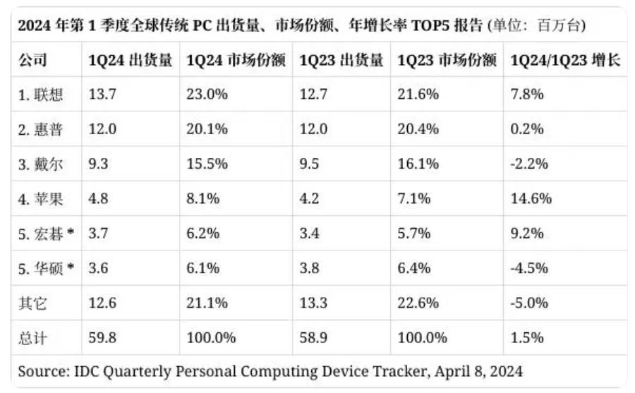 近日IDC發布了2024年Q1全球PC銷量數據,可以看到聯想、夏普、戴爾位列前三名,份額分別是23%、20.1%、15.5%。