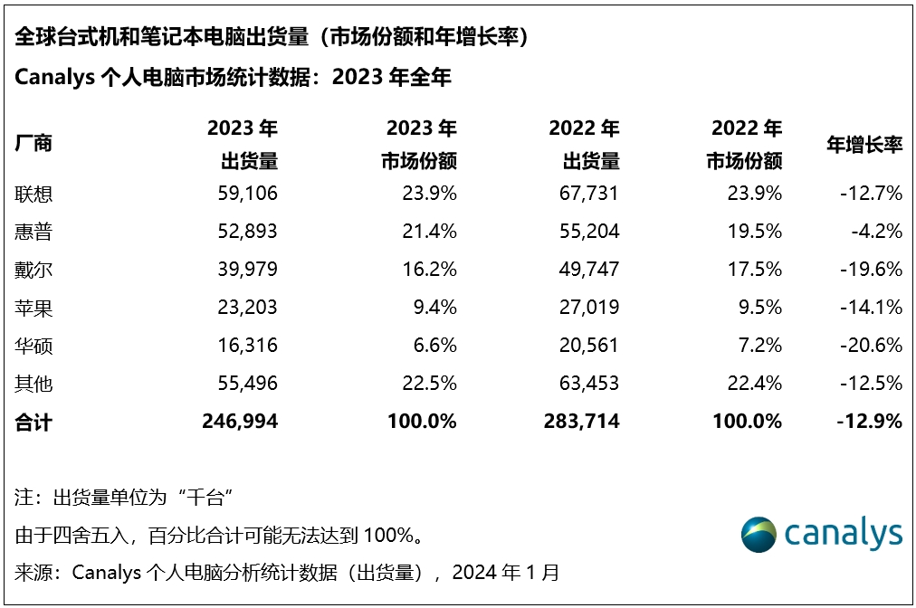 PC銷量:聯想全球和中國都第1,華為中國第3,全球其它