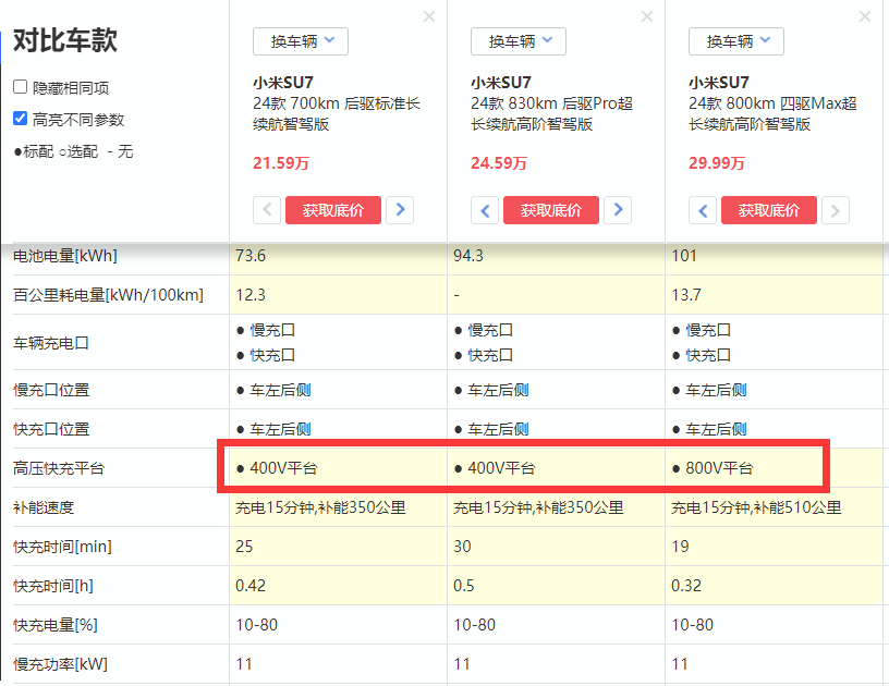 在這里,并未對售價21.59萬元的小米SU7標準版車型做對比,考慮到800伏平臺的缺失,它很難在入門版車型的比較中占得便宜。畢竟20萬出頭就能購買800伏,誘惑力實在是太大了。