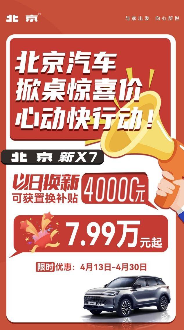 最美人間四月天,正是出門游玩的好時(shí)候,有不少的朋友在計(jì)劃購(gòu)新車出去玩,政策利好的情況下,各大車企紛紛都推出了各種“以舊換新”的置換補(bǔ)貼政策,顯然,北京汽車新X7這波優(yōu)惠無(wú)疑是送到了消費(fèi)者心坎上的力度。4萬(wàn)元置換補(bǔ)貼政策,直接將起步價(jià)降至7.99萬(wàn)元起,對(duì)于市場(chǎng)是一次重磅沖擊,對(duì)于消費(fèi)者更是一個(gè)無(wú)法拒絕的選項(xiàng)。對(duì)于正計(jì)劃換車的用戶來(lái)說(shuō)這份天降大禮不容錯(cuò)過(guò)。